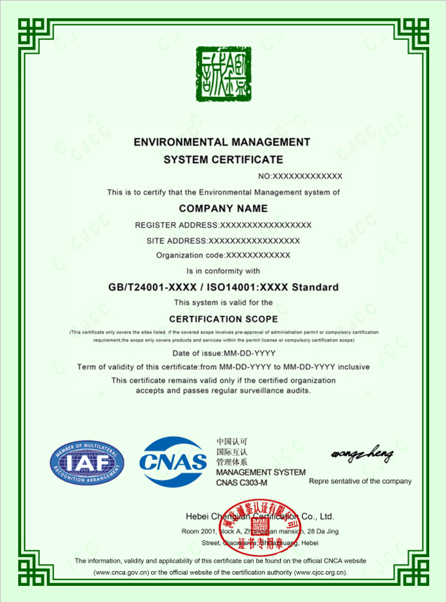 河北誠(chéng)鑒認(rèn)證有限公司(簡(jiǎn)稱(chēng)誠(chéng)鑒認(rèn)證/CJCC),創(chuàng)立于二零一七年,經(jīng)國(guó)家認(rèn)證認(rèn)可監(jiān)督管理委員會(huì)(CNAS)批準(zhǔn)(批準(zhǔn)號(hào)CNCA-R-2018-412),中國(guó)合格評(píng)定國(guó)家認(rèn)可委員會(huì)(CNAS)認(rèn)可(注冊(cè)號(hào):CNAS C303-M)),是從事質(zhì)量管理體系、環(huán)境管理體系、職業(yè)健康安全管理體系認(rèn)證,具有獨(dú)立法人資格的第三方認(rèn)證機(jī)構(gòu)。